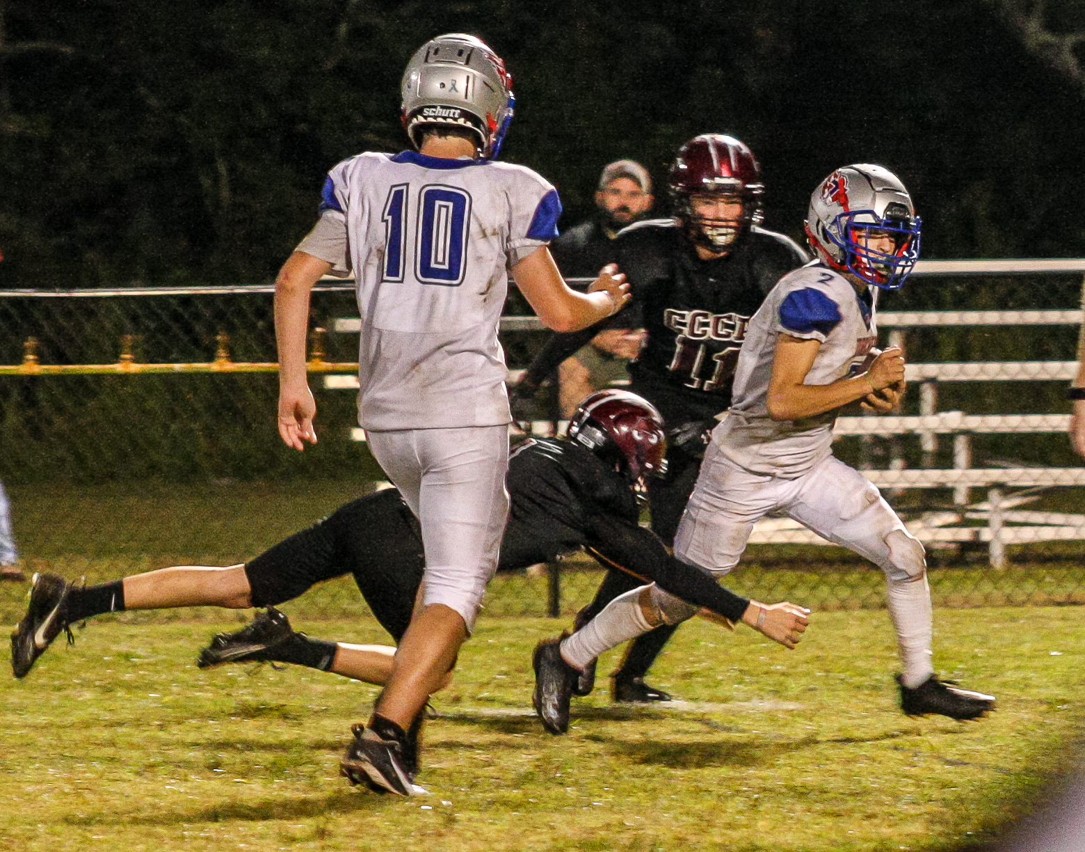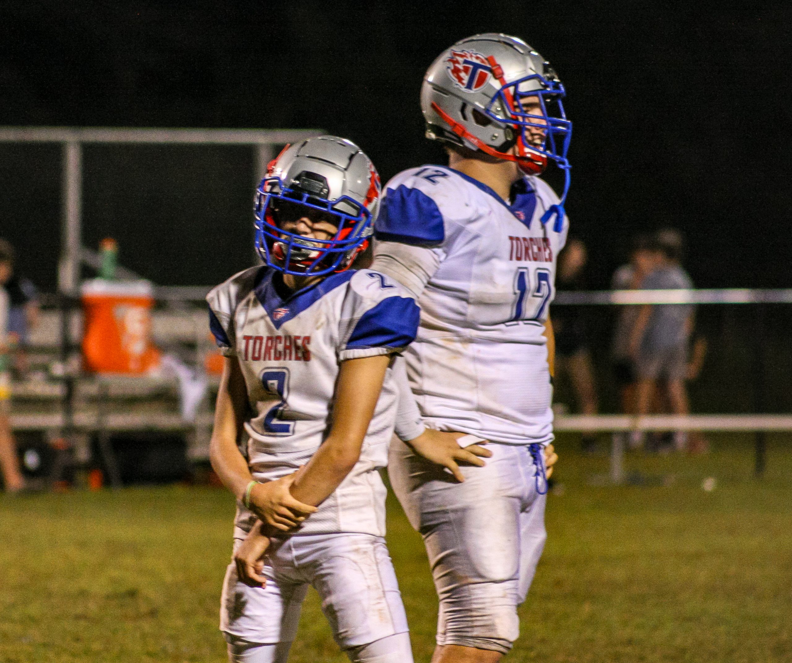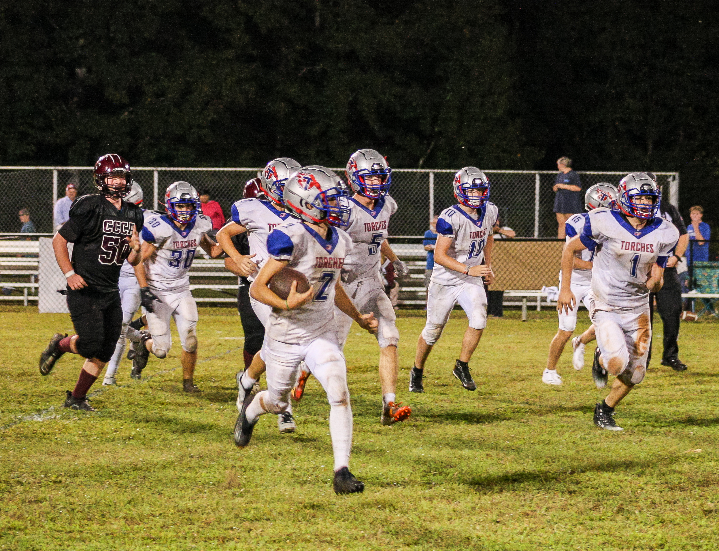 Coach Davis’ Torches wasted no time after receiving the opening kickoff from the Eagles, as senior standout Aaron Peters connected on a deep throw to speedy receiver Kyle Gillis, who swiftly found the endzone with Eagles in tow. This, and Gillis’ run on the ensuing two-point conversion, would put up 8 of Tabernacle’s 40 unanswered points on the night. The Torches and Eagles would continue to exchange scoreless drives, keeping the score set at 8-0 entering into the second quarter. Midway through the 2nd, however, the Torches would hit pay dirt on another long pass, this time to Junior Ian Anderson, who was hit in stride downfield on the 65-yard play and would never look back. This propelled the tally to 14-0, where it would stay going into the half partly due to costly penalties by both sides.