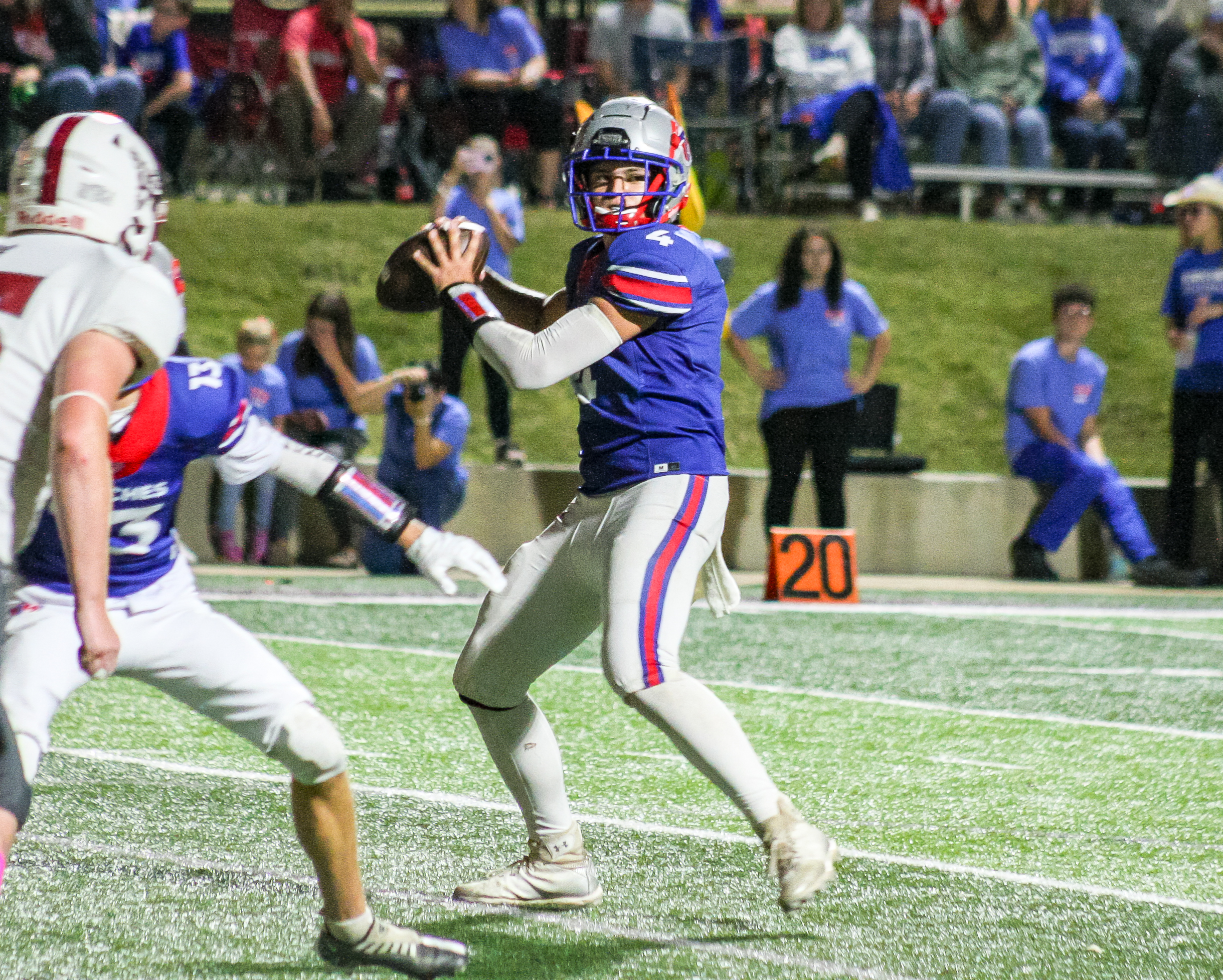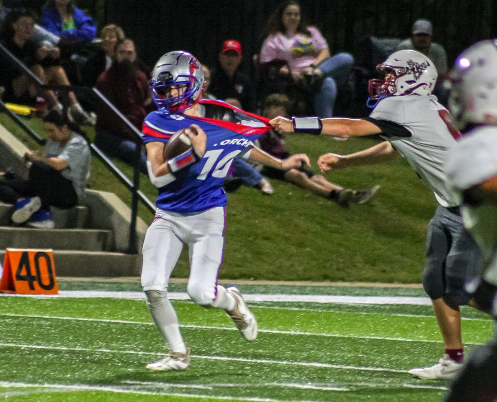 Though a long scoring run by senior Braden Odom was negated by a penalty, the defense immediately created another scoring opportunity. Freshman standout Kobe Sharp intercepted an Eagles pass and returned it 50 yards for a touchdown. Andrews caught another two-point conversion, widening the gap to 24-0 midway through the second quarter.